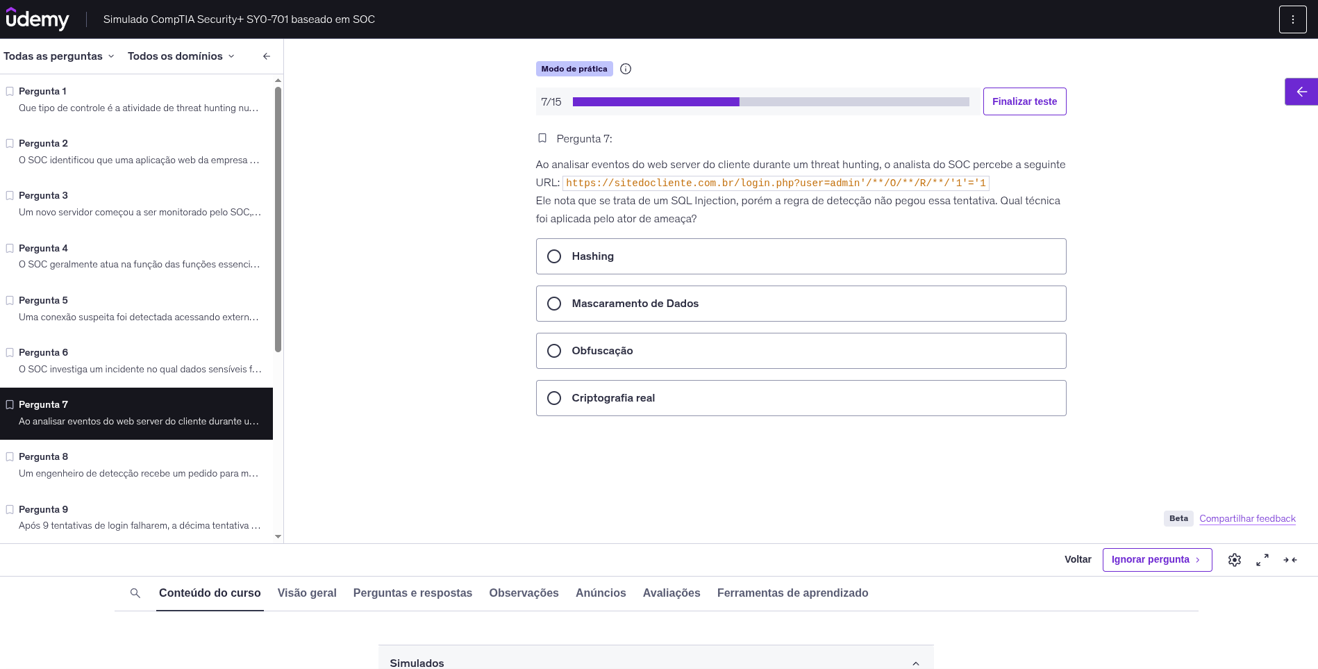Explicação: Sabe-se que o operador 'OR' é muito usado em ataques de SQL Injection. No entanto, na URL da questão, aparecem comentários de SQL entre o 'O' e o 'R' e em demais partes. Como comentários são ignorados na execução, que nesse caso seria no banco de dados da aplicação web, então se trata do operador 'OR'. A regra de detecção de SQL Injection não pegou essa tentativa pois, provavelmente, contém os caracteres 'OR' diretamente escritos na regra, sem prever possíveis comentários de SQL, e como o SIEM interpreta os caracteres como textos puros e não como comandos de SQL, então ele não usou a regra em questão. Essa é uma tática muito comum de obfuscação, pois não foram escondidos os caracteres reais do dado (no caso, do comando), e sim criadas distrações irrelevantes na execução do comando para tentar evitar de ser detectado justamente por regras de SIEM, pois é muito difícil um engenheiro de detecção de um SOC prever todos os tipos de obfuscações possíveis de serem empregadas numa string - principal motivo da necessidade de trabalhos de threat hunting em SOC. O caso não é de hashing pois os dados não foram criptografados de maneira unilateral, nem de criptografia real pois é possível ver o comando SQL entre os comentários, e também não é mascaramento de dados pois é possível ver todos os caracteres, e não apenas uma parte, usados no comando SQL, só que entre comentários.